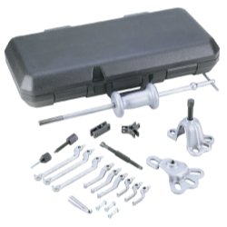Contains: OTC1155 - Slide hammer w/5 lb. hammer, OTC7372 - Rear axle pulling attachment, OTC24544 - 3-way cross head, OTC24545 – Cone, OTC27241 - 2-way cross block, OTC27315 - Puller hook attachment, OTC34698 - Pulling jaws (3) for internal or external pulling jobs, OTC 05378 - Grip wrench adapter w/single lead (wrench not included), OTC205377 - Dent puller, OTC 4148 - Internal/external pulling jaws (3), 6-1/2in., OTC32054 - Internal puller jaws (3), 2-3/8 in., OTC7208 - Front hub puller assembly, OTC309321 - Forcing screw and OTC215895 - Sleeve.